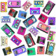 Estos modelos coloridos brillantes de neón frescos y retros de la vuelta de los años 80 y de los años 90 en las cintas de casete son perfectos para el individuo de moda y elegante. Su diversión e impresión juguetona es grandes para muchos regalos y ocasiones. Disfrute de este diseño divertido y de moda para su próxima compra; para sí mismo, sus amigos, o su familia.