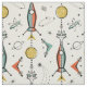 Mi ilustracion vectorial original de los Cohetes Católicos Católicos Retro, satélites, lunas, átomos, starburst, galaxias, pulsares, ondas sonoras y estrellas de tiro, en oro, aquamarina, naranja oscuro, negro y blanco roto.