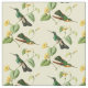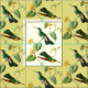 Dos colibríes verdes claros con las mascarillas blancos y negros se encaraman en una vid tropical con las flores amarillas brillantes. Mostrado en un fondo amarillo claro; "personalizar selecto él" para cambiar color de fondo.