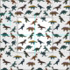 Perfecto para hacer regalos para los amantes de los dinosaurios o las cortinas o de los objetos de decoración de la casa que son perfectos para las habitaciones de los niños. Esta tela tiene un patrón general de fotos de dinosaurios de juguete plástico en una variedad de colores colocados sobre un fondo blanco.