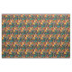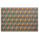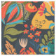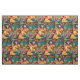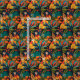Un patrón colorido abstracto de flores en tonos azul marino, dorado, naranja y verde.