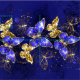 Composición de lujosas mariposas de zafiro y joyas de oro sobre fondo de textura azul.