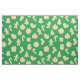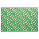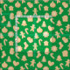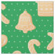 Esta tela de algodón de vacaciones adorable presenta un patrón de galletas de pan de jengibre de las medias, hombres de pan de jengibre, bastones, campanas, árboles de Navidad y más sobre un fondo verde con puntos blancos. Diseñado por la artista Susan Coffey.