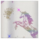 Un patrón de bonito y colorido de unicornios de cristal (cada unicornio está hecho de pequeños cristales de color arcoiris -impresos solamente) con chispas azules y rosas al final de sus cuernos. Todas están repartidas sobre un fondo plateado de lujo, con pequeños montones de purpurinas dorados esparcidos a su alrededor.