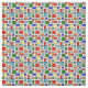 Esta tela tiene un diseño Bauhaus de una rejilla con cuadrados y rectángulos en rojo, verde, azul, naranja, azul claro, amarillo y rojo.