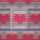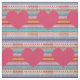 Un diseño de tela con un diseño de corazones rosados contra rayas de arcoiris en un falso patrón de cuchillos crotchet. Perfecto para chicas/ropa infantil. Diseño original y caprichoso.
