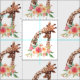 Tela con un lindo dibujo en acuarelas de una madre y una jirafa de bebé. La jirafa madre está descansando su cabeza sobre la jirafa del bebé, amorosa y adorable. un ramo de flores color agua rosa, amarillo, verde y colocado debajo de este querido par.