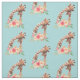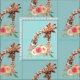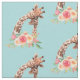 Tela con un lindo dibujo en acuarelas de una madre y una jirafa de bebé. La jirafa madre está descansando su cabeza sobre la jirafa del bebé, amorosa y adorable. un ramo de flores color agua rosa, amarillo, verde y colocado debajo de este querido par.