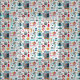 Un bonito tejido de verano azul y rojo con un barco de crucero, otros objetos de playa y gente simpática