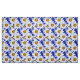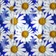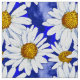 Tela en un patrón acuarela de margaritas blancas con centros amarillos dorados, sobre un fondo en tonos de azul denim