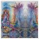 Elegante, caprichoso y artístico diseño en vivos colores rosa, azul, rojo, morado Watercolor pintura 1989.—Vivien , esta misteriosa hembra le dio a Arthur su espada, Excalibur. Ella robó Lancelot cuando era un niño y lo curó cuando se volvió loco. Puede ser una divinidad del lago celta en su origen, tal vez del mismo tipo que el Gwagged Annwn - hadas lacustres en el folklore galés moderno. Vivien bien puede haber sido la Dama del Lago en las Leyendas Arturas e historias. Ella, a veces llamada Nineve, Nimue, Niniane, etc., es más conocida como la mujer que selló a Merlin en una cueva o un árbol.