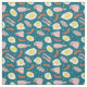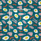 Tela azul oscuro con un divertido patrón de comida de huevos fritos para el desayuno, bacon y salchichas