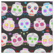 Festividades, cráneos azucareros mexicanos en tela de personalizable para crear tu propio traje, decoración o arte para el Día de los Muertos. Estos cráneos tienen muchos detalles de colores vivos y destacan en un color de fondo negro. Puede ajustar el tamaño del patrón para satisfacer sus necesidades de costura y artesanía.