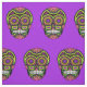 Presenta un colorido patrón de cráneo de azúcar sobre un fondo morado.