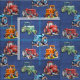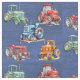 Denim tela azul con patrón de tractores agrícolas. Las imágenes de los tractores son verdes, rojas, azules y naranjas y se imprimen sobre un color de denim azul oscuro. El tejido no es denim, es parte del diseño solamente.