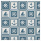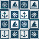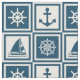 Diseño de temática náutica con velero, velero, brújula y decoración de ancla en cuadrados de rayas blancas y azules