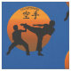Dos combatientes del karate con el sol naciente y karate de la palabra en lengua japonesa en colores anaranjados y negros