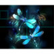 Dos libélulas transparentes, luminosas, turquesas, dibujadas de forma artística sobre el fondo nocturno con algas lacustres luminosas y luciérnagas. Flauta de dragón resplandeciente.