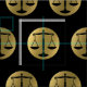 Diseño con elegantes escalas gráficas de oro de símbolo de justicia sobre fondo negro.