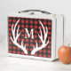Fiambrera metalizado rústica con las astas blancas de los ciervos, la letra inicial blanca, y un fondo de la tela escocesa del control del búfalo.