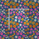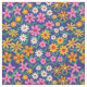 Este es un hermoso patrón retro de flores boho en rosa, naranja, amarillo y blanco con ramas y hojas verdes sobre fondo azul marino.