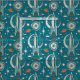 Mi ilustracion vectorial original de una escena espacial estilizada, inspirada en los años cincuenta y sesenta atómicos, en verde azulado, naranja oscuro, blanco antiguo y acuático minado, con una variedad de texturas. ©Christine Duffield 2022