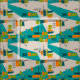 Los modernos rectángulos de mediados del siglo, en tonos naranja, dorado y verde azulado, con un fondo beige y líneas negras. El tejido perfecto para su decoración de mediados del siglo XX.