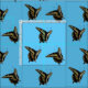 Imagen fotográfica de la mariposa negra y amarilla, replicada en tres ángulos diferentes, luego enlosada a través del tejido. Anise Swallowtail (Papilio zelicaon) Fondo azul claro.