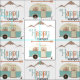 El arte digital cutáneo incluye el texto "Happy Camper", la flecha de estilo Boho, la silueta de montaña y el trailer de viaje RV de estilo retro