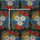 Una imagen de un estampado de flores con una mirada de la costura de las flores alpinas blancas de Edelweiss de Europa en su producto. Colores azules, rojos, amarillos, y blancos. Alpinum del Leontopodium de Suiza, de Alemania, y de Austria.
