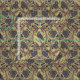 Esta tela tiene cuervos, libélulas y escarabajos rodeados de flores y hojas en tonos malva y gris sobre un fondo tostado.