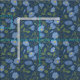 Esta tela floral con motivos florales contiene ilustraciones de flores de color azul perwinkle con hojas verdes colocadas sobre un fondo color azul marino.