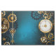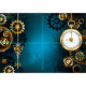 fondo turquesa, texturado, de vapor punk con bronce y oro, llave de plata y reloj. Estilo Steampunk.