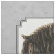 Caballo friesio negro con una larga melena ondulada que muestra los tonos amarillos cálidos a partir de la tarde del sol, todo sobre un fondo gris plateado.