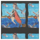 Esta tela personalizado al lado del patio tiene la imagen de una bruja divertida con un traje de baño que sobrevuela el océano en su camino a la playa con su gato colgando en el extremo de su escoba con gaviotas blancas volando a su lado en un marco ondulado sobre un fondo negro. ...