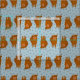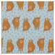 Ilustraciones de vacas de tierras altas de color marrón rojizo se colocan sobre un fondo de puntos de polka azul pálido en esta tela con estampado.