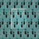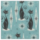 Para el gato amante, el entusiasta retro, mi ilustracion vectorial original de gatos negros elegantes, starburst, y diamantes en estilo atómico de mediados de siglo, en gris negro y pálido, en un fondo azul cadete, con grano de tela simulado. En esta variación los gatos están en filas horizontales, también disponibles en formato vertical.