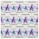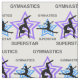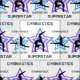 Chicas de tela de superestrella de gimnasia. Tiene estrellas moradas y azules por todas partes, con silueta de gimnasta dando un salto y un peón trasero.
