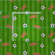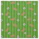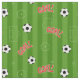 Tela divertida impresa con un patrón de balones de fútbol, rayas verdes, marcas de tono blanco, ¡y la palabra GOAL!