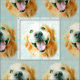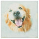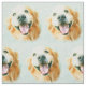 Esta tela ofrece un retrato tejado de la acuarela de un perro sonriente del golden retriever, en un fondo azul.
