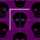 Estos cráneos negros están en un patrón de puntos de polka, en un fondo morado de gótico.