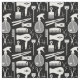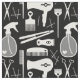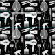 Tela estilista en un diseño retro de moda con herramientas de peluquería en blanco con corazoncitos bonitos contra un fondo negro.
