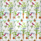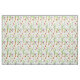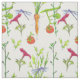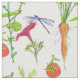 Tela de jardín decorada con plumas y ilustraciones de tinta de zanahorias y tomates con una libélula azul hecha a lápiz de color.