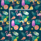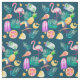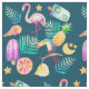 Esta tela linda se divierte un modelo colorido de las imágenes del verano, incluyendo un pájaro toucan, un flamenco rosado, un cono de helado, barras de helado, una rebanada brillante del pomelo, y un limón, rodeado todo por las estrellas del oro y las hojas de palma verdes. Las imágenes coloreadas, brillantes multi se ponen en un fondo verde azulado oscuro. ¡Brillante, colorido y diversión, no importa dónde usted pasa el verano!