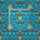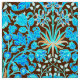Tela en un modelo de William Morris del vintage de los jacintos, tulipanes y hojas, en las sombras de la aguamarina suave y del azul cerúleo, acentuadas con el rosa coralino y el naranja, en un fondo marrón oscuro