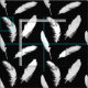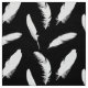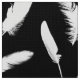 Impresión en un fondo negro - diseño gráfico de la pluma blanca de las técnicas mixtas de las plumas blancas, flotando en una tela del fondo que pone en contraste