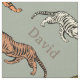 Tejidos de color tierra impresos cerca del patio. La tela está decorada con un patrón tigre con un nombre personalizado colocado en diferentes posiciones y con ligeras variaciones de color. Buen material para un proyecto de manufactura de habitación para niños, un proyecto de costura u otro proyecto creativo para y por un amante del gato salvaje.