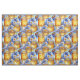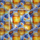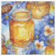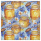 Este tejido presenta un patrón de jarras acuáticas de miel con agitadores de miel y flores azules.