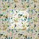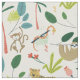 Diseño caprichoso de patrones con exuberante vegetación de jungla y ilustraciones animales incluyendo tigre, loro, pereza, mono y serpiente.