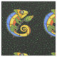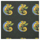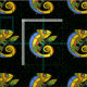 Esta tela personalizado del patio tiene una imagen repetida de un lagarto abstracto brillante en verde, amarillo, naranja y azul con grandes ojos redondos sosteniendo una rama con una hoja sobre un fondo negro con puntos de polka verde.